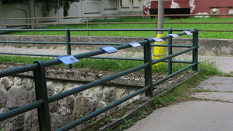Work realized as part of the project Abandoned Recreations in the bath city Trenčianske Teplice, where the Film festival is placed every year. The installation of six flipbooks is made from drawings on transparent foils of the spatial inscriptions of abandoned hotel's names in the city. The viewer creates the illusion of movement around the hotels by quick browsing the drawings. The names of the hotels installed on the ordinary bridge in the city gardens ironizes the official “Bridge of Fame”,where are written the names of famous directors and actresses who visited the film festival .