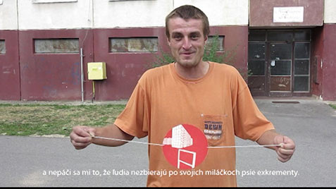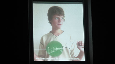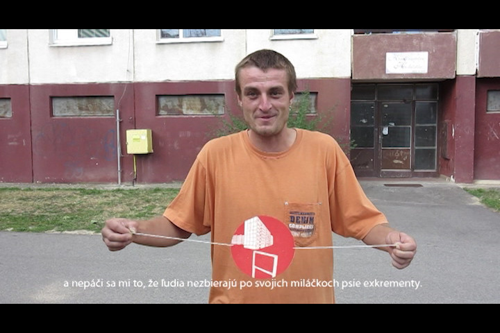 The project uses form of the pre-cinematographic device called Thaumatrope. A disk or card with a picture on each side is attached to two pieces of string. When the strings are twirled quickly between the fingers the two pictures appear to combine into a single image due to persistence of vision. Eight linocut motifs from the block of flats habitation are printed in different combinations in two colours. The inhabitants of suburb Rozkvet plays with the optical toys and tell their negative and positive remarks about the life in the habitation.