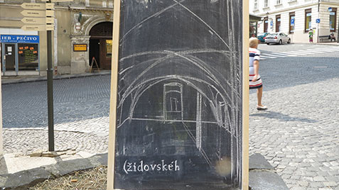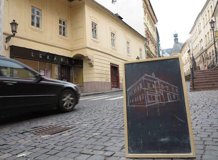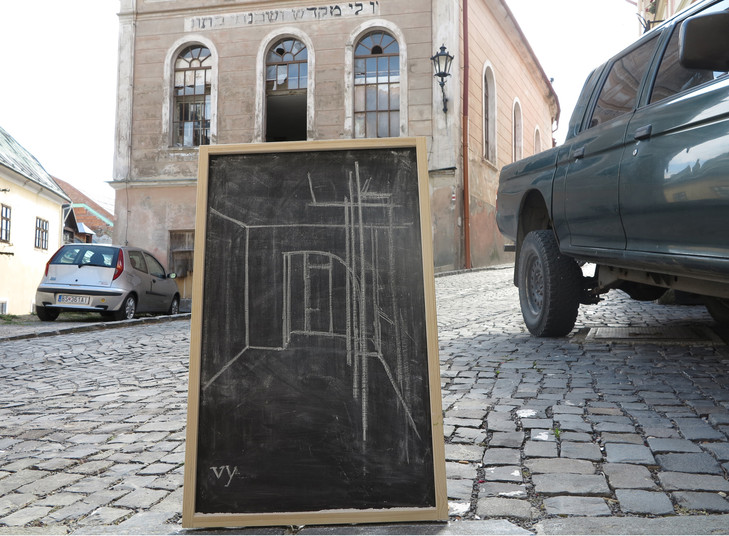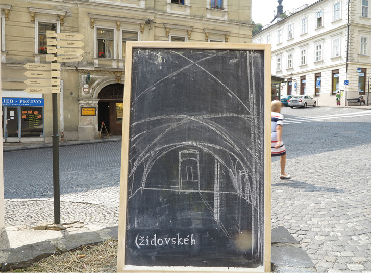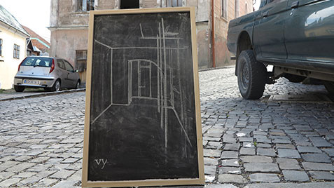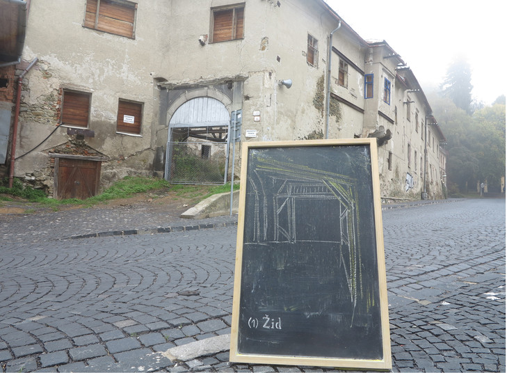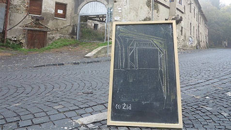 Project about the jewish history in the city Banská Štiavnica. In front of 16 buildings which used to belong to jewish inhabitants of the city is placed the vertical blackboard with white charcoal animation about the movement in the inner space of the building. The emptiness of the space gets new meaning in the interviews with 16 persons who have personal experience with holocaust.