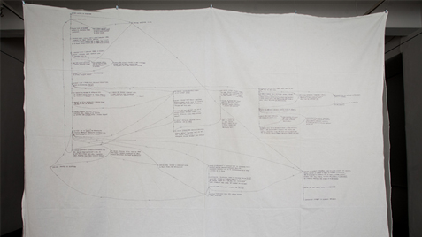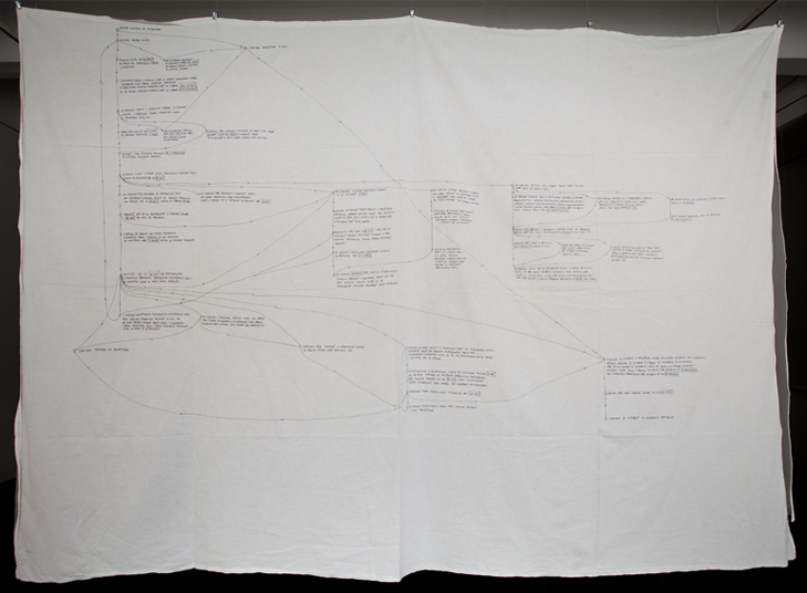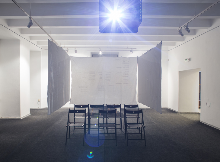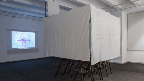 2016, Installation of sheets, videoprojection (53min), aquarel drawings