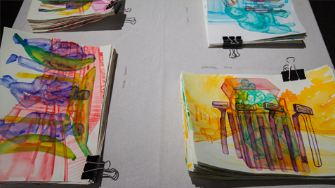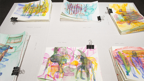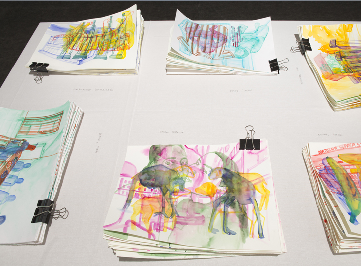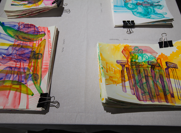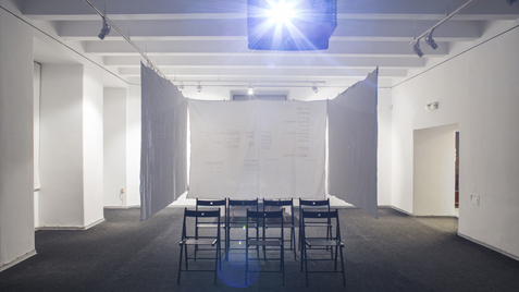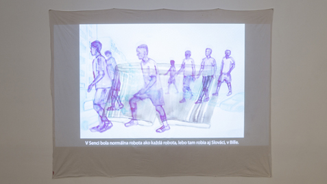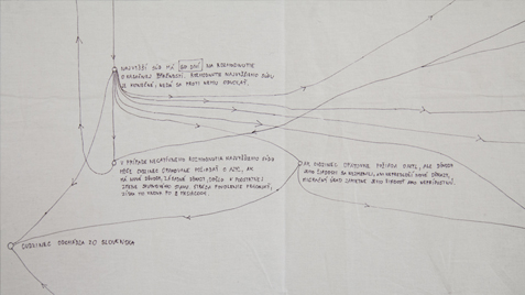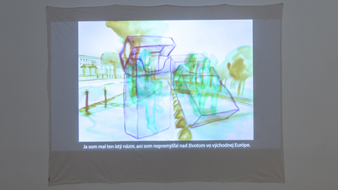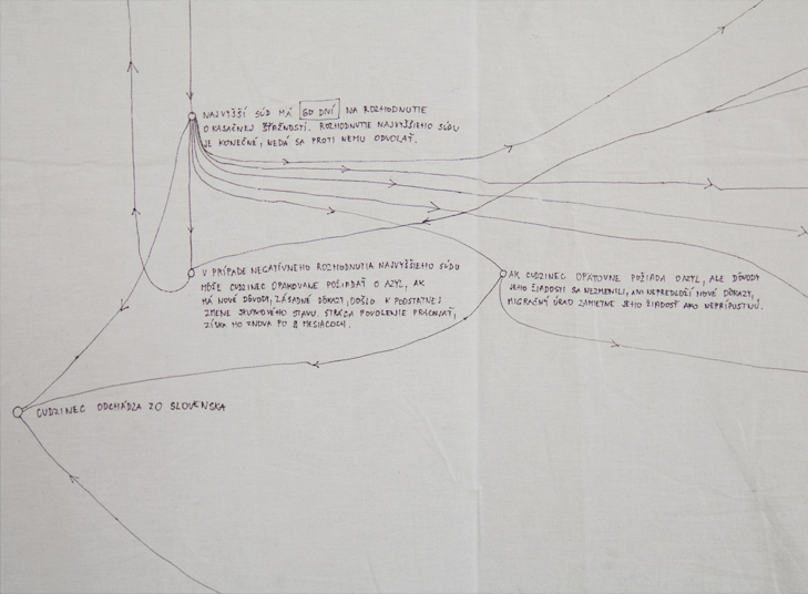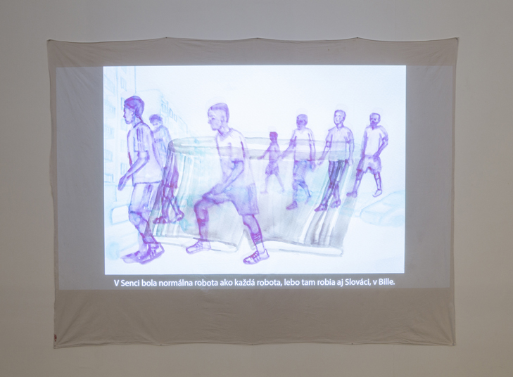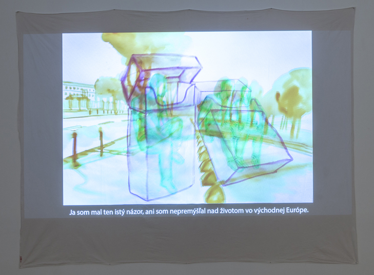 The installation questions the motivation of foreigners why have they decided to live in Slovakia. The space of the room is devided by authentic sheets from the refugee camp in Rohovce into two areas. The first one is the semi-closed, private space where the visitor can sit and see the videoprojection of the intimate videoportraits of 6 refugees. They tell their stories from the moment they arrived to Slovakia, either in their native language or in Slovak if they can speak it fluently. Their speech is accompanied by animation which uses watercolour drawings and its slow fade-over to create associative illustrations of the text. Every drawing is made from several layers in different colors, the first one is always the view on some part of Bratislava. Then it's slowly overlayed by imaginary drawings of figures, animals, everyday objects. The second part of the installation is outside of the sheets. On the frontal sheet there is the drawing of the graph of migration system in Slovakia. The visitor can also browse in the original aquarel drawings situated on the table next to the installation of sheets.