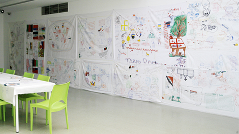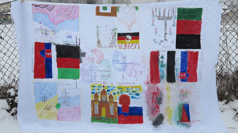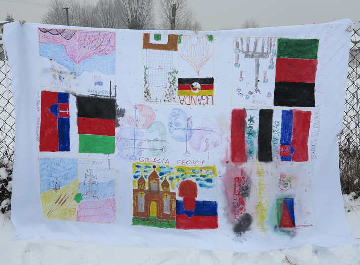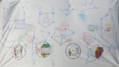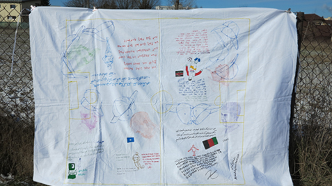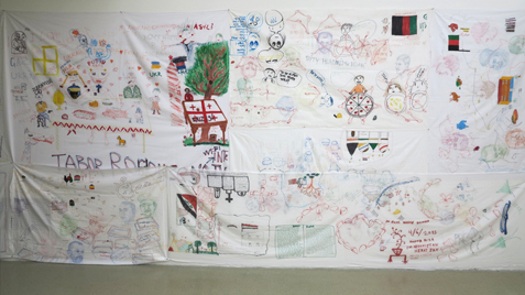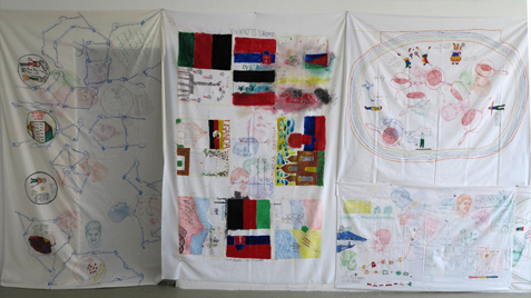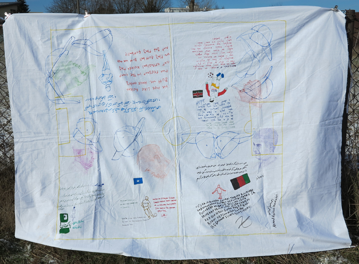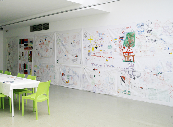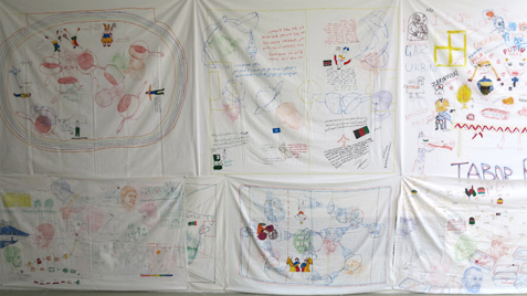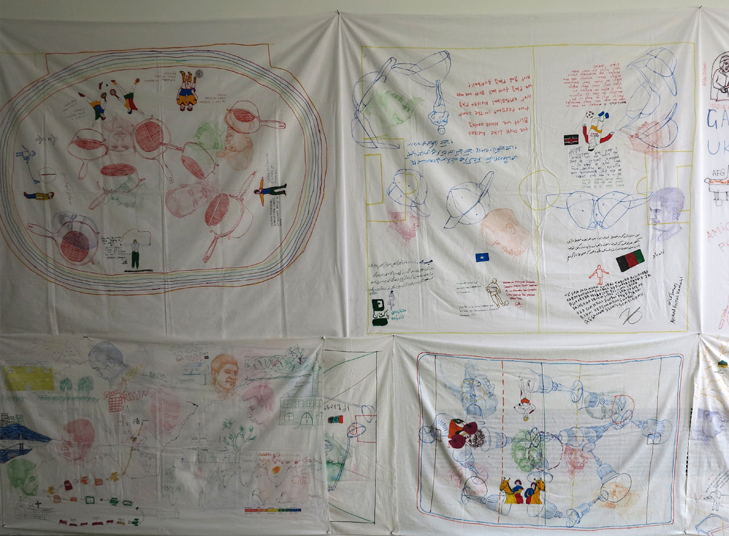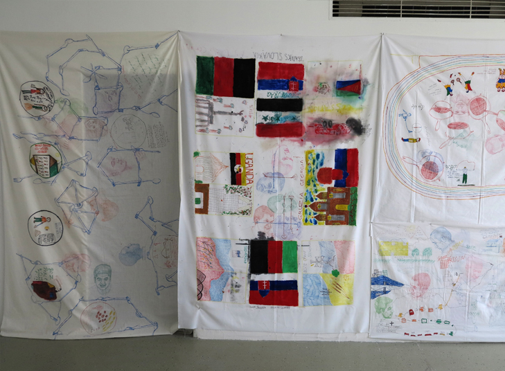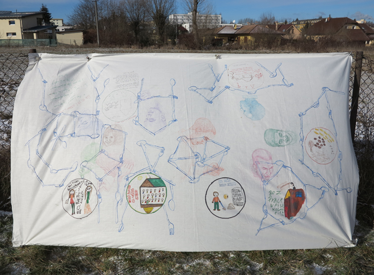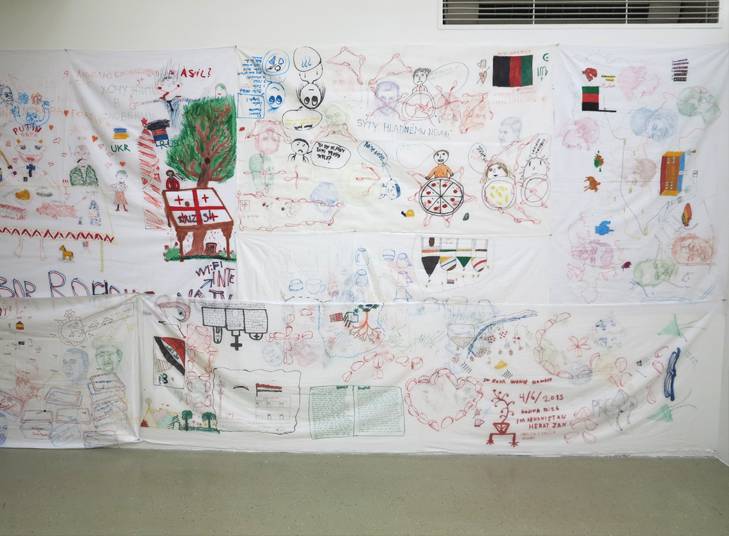 Installation of various painted textiles, app. 10m x 3mWork is part of the participatory project with refugees in Slovakia. Author has organised workshops with refugees which took place in public spaces or institutions in Bratislava or other cities (marketplaces, train station, former textile factory, Goethe Institute, etc.). During these workshops refugees were painting on the common textile cloth spred on the table. People passing by could join them or just talk with them.