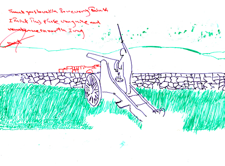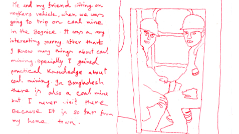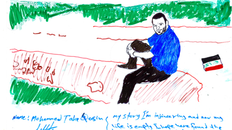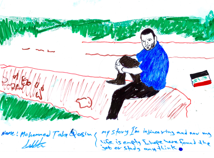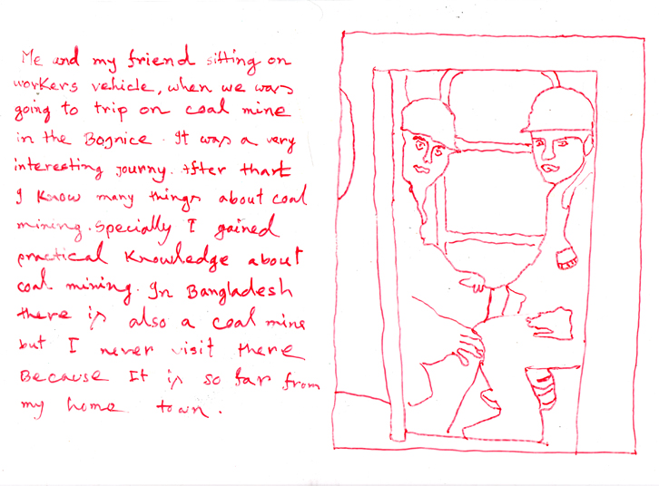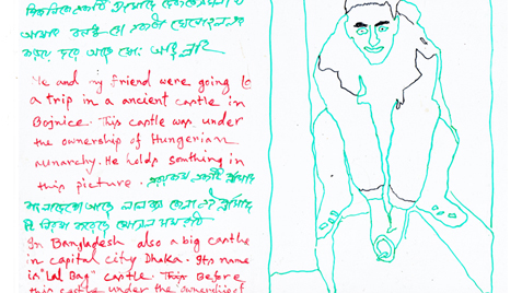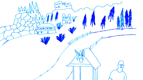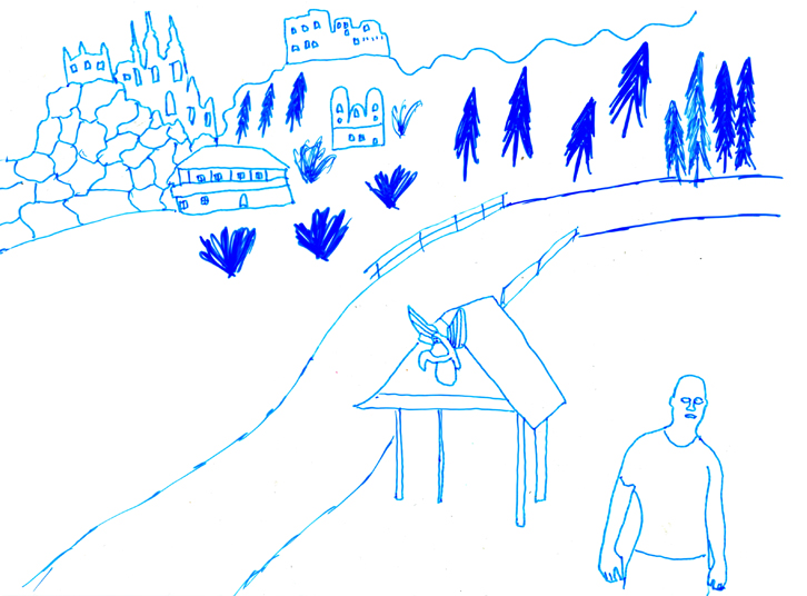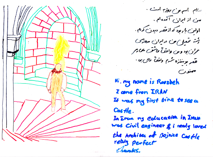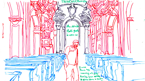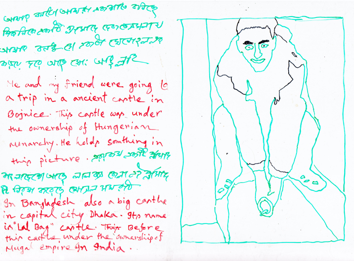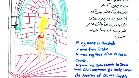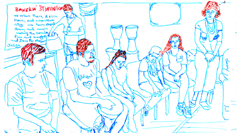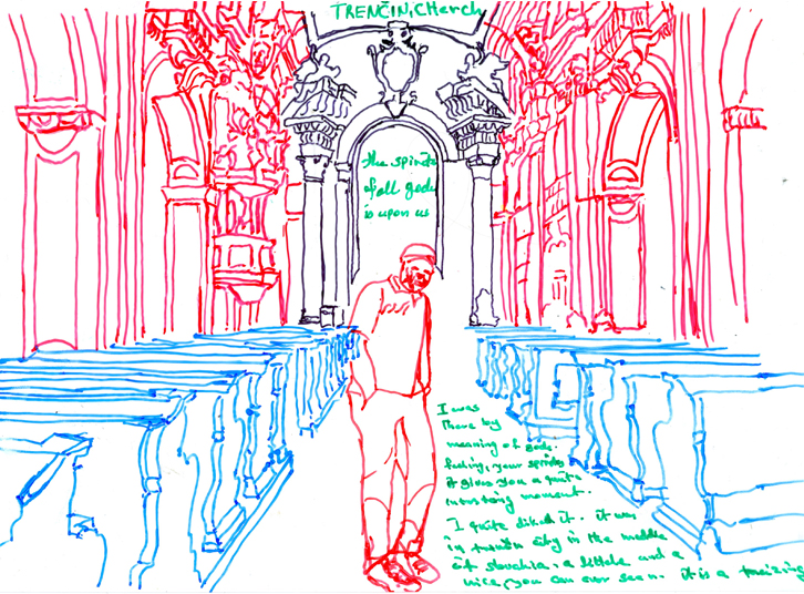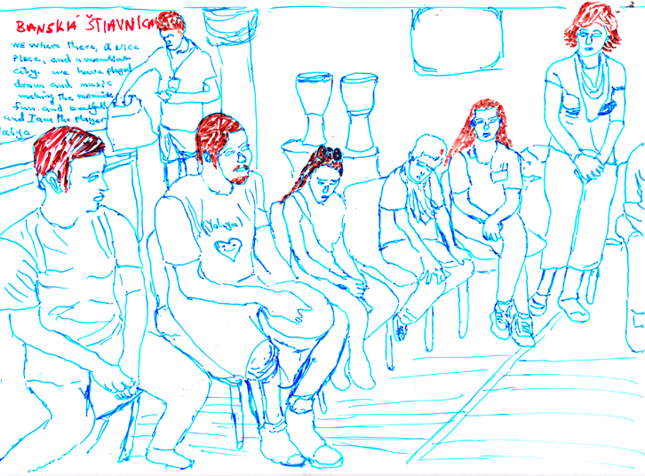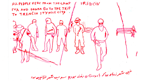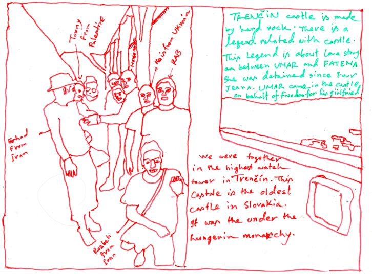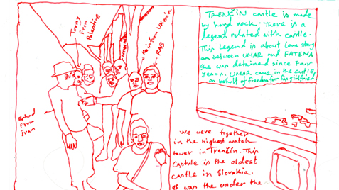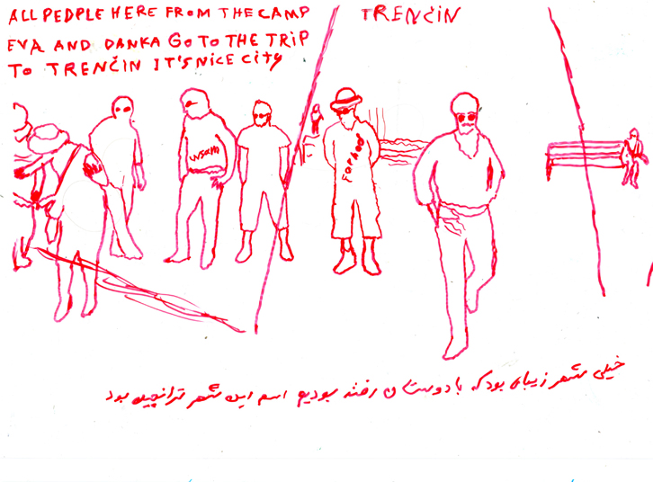 Serie of drawings on transparent folia, format A4Work is part of the participatory project with refugees in Slovakia. Fist author visited with the refugees some Slovak cities, sightseeings and interesting touristic destinations. Later they used photos of these excursions as a sample for their new drawing on transparent folia where they added also their feelings, notices, observations.